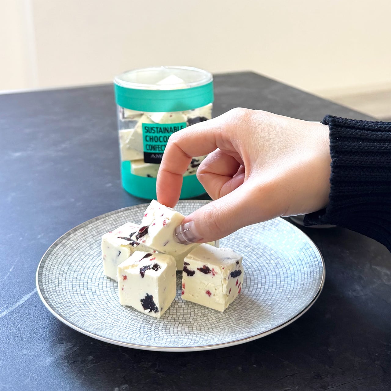 甘酸っぱいドライストロベリーやチェリーを入れ、ふわりと軽い食感に仕上げたホワイトチョコレート。